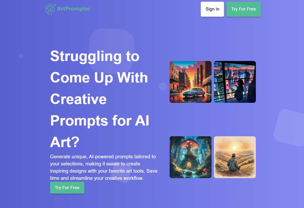 The application, ArtPrompter, is designed to generate unique, AI-powered prompts for users looking to create art. It offers tailored prompts based on selected m